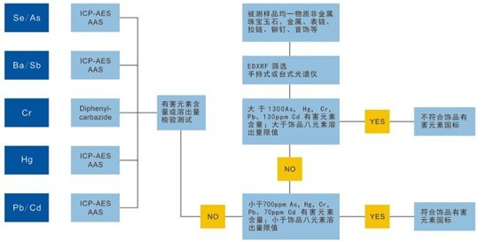 另外XRF由于只是测试元素的总含量,而无法进行溶出量的检测,我们可以通过XRF测试元素总量是否超过了溶出量最大限量,如果超过溶出量最大限量,则必须通过其他光谱分析检测设备(如ICP、AAS)来确定元素的溶出量是否超过了最大限量,所以如果要全方位的解决饰品中有害元素检测解决方案,单只靠XRF是无法全部做到的,还要进行其它分析测试,下图表示XRF检测饰品有害元素的筛选性初检分析方法: