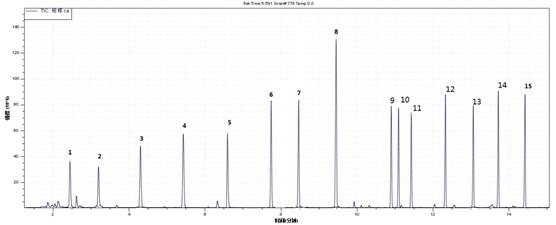 1.正己烷 2. 3.三氯乙烯 4.甲苯 5.辛烯 6.乙酸丁酯 7.乙苯 8.对(间)二甲苯 9.邻二甲苯 10.苯乙烯 11.壬烷 12.异辛醇 13.十一烷 14.十四烷 15.十六烷