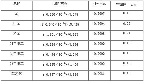 7种苯系物在进样量1-320ng范围内线性相关系数为0.9981-0.9999,线性关系良好。以响应信号为基线噪声10倍时对应的进样浓度作为定量限,确定物质的定量限均小于0.21μg/m3。