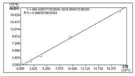 准确吸取浓度为10ug/mL的甜蜜素标准溶液10ul于50ml离心管中对应衍生物浓度分别为2ug/mL、10ug/mL、20ug/mL、100ug/mL、200ug/mL,按照上述标样衍生化步骤进行衍生化,进行线性测试。实验所得线性方程为:y=940.43x-3525.57,线性相关系数为0.9984,如图5所示。