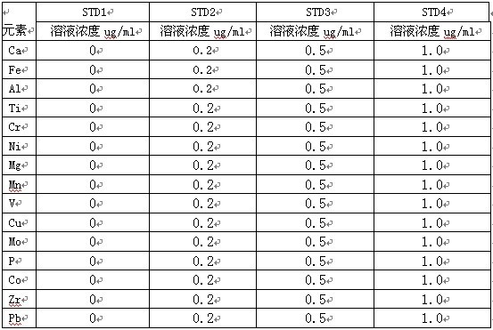 样品处理:称取0.5000g试样置于100mL烧杯中,加5mL盐酸、2~3mL硝酸,置于电热板上加热溶解,加入5ml高氯酸,加热至冒烟,取下冷却,加入20mL水,加热溶解盐类。冷却,移入100mL容量瓶中,用水稀释至刻度,混匀。试液中如有碳化物、硅酸等沉淀物析出,须干过滤。