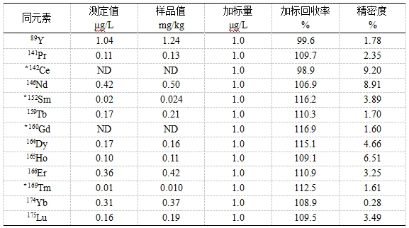 参考《GB/T 18115.1-2020 稀土金属及其氧化物中稀土杂质化学分析方法 第1部分:镧中铈、镨、钕、钐、铕、钆、铽、镝、钬、饵、铥、镱、镥和钇量的测定》,将高纯氧化镧用稀硝酸溶解,利用内标法进行校正。考察加标回收率及精密度。方法加标回收率为98.9%~116.9%,精密度为0.28%~9.20%。