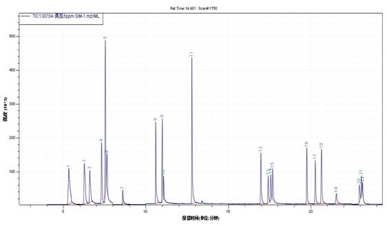 样品测试方法(纺织品产品):称取4.0g样品,用 80mL 酸性汗液于 37℃水浴振荡提取 60min,取 20mL样液于 50mL 具塞试管中,加入 2mL 醋酸盐缓冲液摇匀。依次加入 2mL 四乙基硼化钠溶液和 2mL 正己烷,振荡 15min 后,取上层有机相过硅胶柱净化,用正己烷洗脱并浓缩定容至10mL,进行 GCMS 分析。