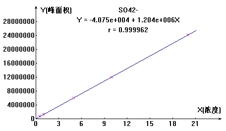 按照硫酸根各浓度点依次进样,计算其峰面积,以浓度和峰面积绘制标准曲线,线性相关系数为0.99996,结果详见图1。