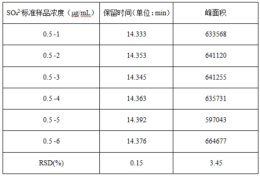 硫酸根离子标准溶液采用梯度浓度的方式逐级稀释为0.5μg/mL、1.0μg/mL、5.0μg/mL、10.0μg/mL、20.0μg/mL的标准溶液;详见表1。